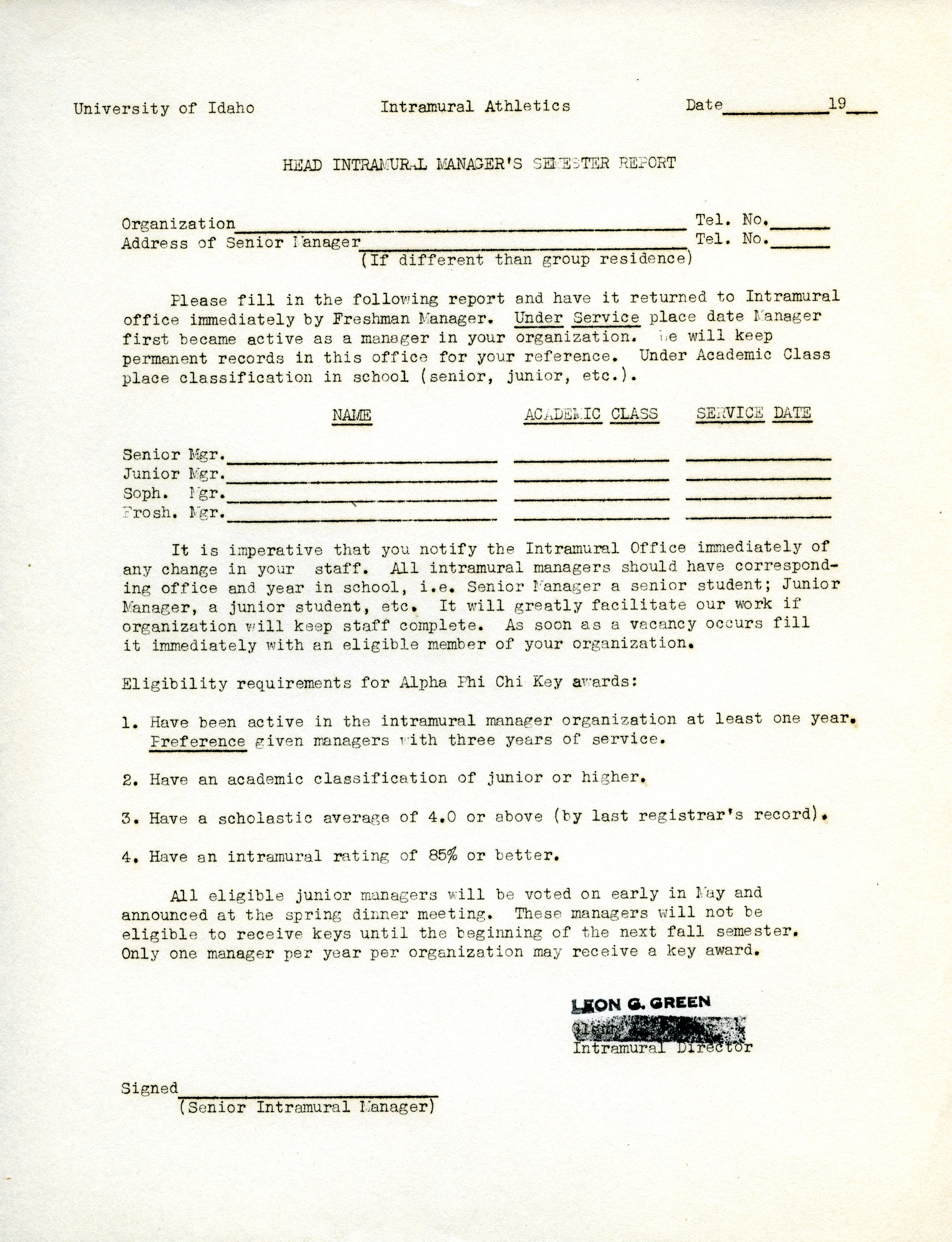 - "Head Intramural Manager's Semester Report", University of Idaho Intramural Sports collection, UG 087, University of Idaho Library Special Collections and Archives, manager_report, Idaho Harvester, Special Collections and Archives, University of Idaho Library