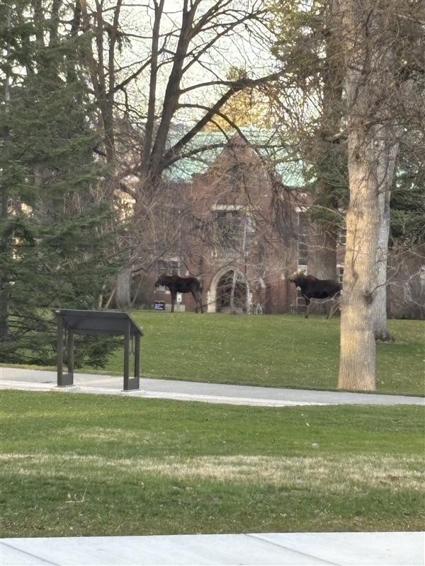 - "Moose on the administration building lawn.", University of Idaho Library Special Collections and Archives, moose_admin_lawn, Idaho Harvester, Special Collections and Archives, University of Idaho Library