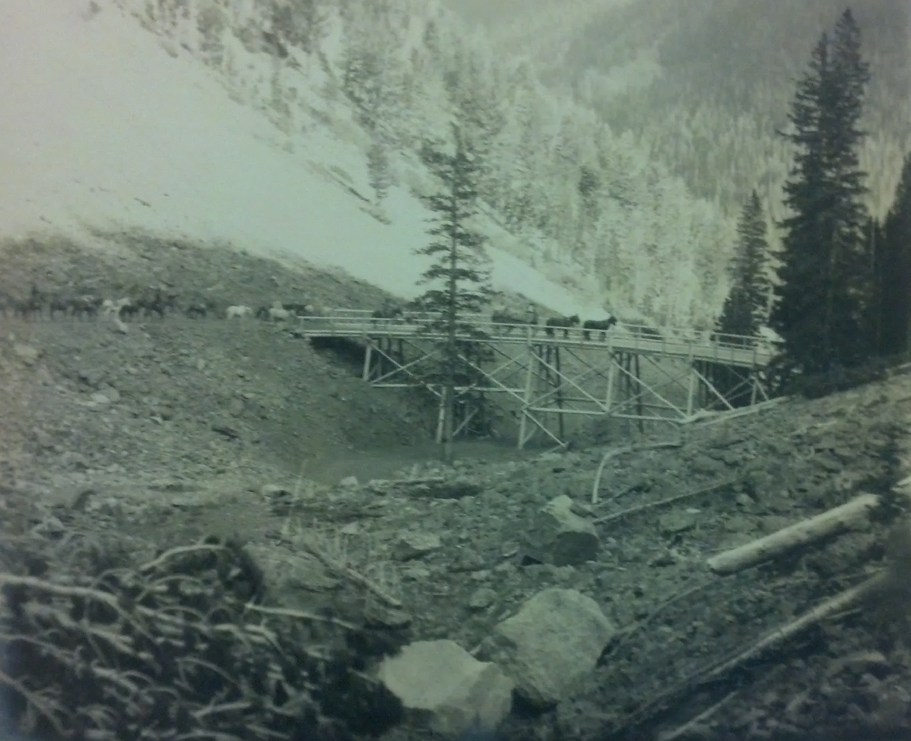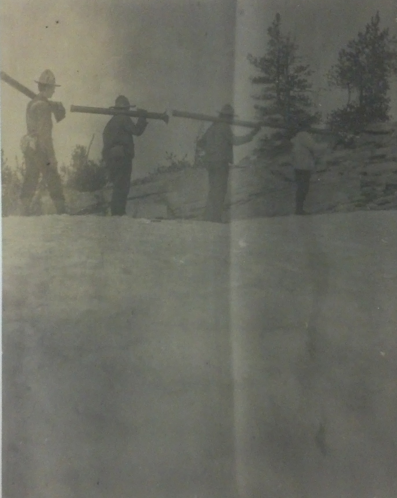 Howard Brady Carpenter, working as U.S. Deputy Surveyor, from 1904 through 1906 surveyed the watershed divide at the crest of the Bitterroot Mountains between the Montana-Idaho border in order to correct the boundary line created in 1864. Charting a route from north to south, Carpenter marked and noted each mile of the survey in remote and rugged wilderness. His survey notes provide details about the area’s landscape, geology and vegetation. Carpenter’s survey determined that the original boundary line set by the U.S. Congress (the crest of the continental divide) extended 3 miles further south than its previous determination. Depending on terrain and weather, Carpenter and his crew of 21 men completed 1.5 miles to 2 miles per day, working seven days a week. His crew and pack train of 44 horses blazed the trees along the survey line and built markers of brass caps on iron pipes or raised mounds of rock approximately every quarter mile.