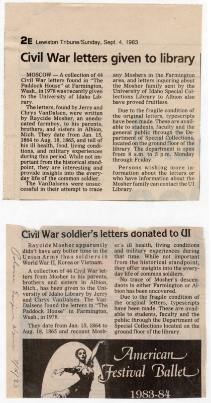 The University of Idaho Library presents a new digital collection, the Raycide Mosher Civil War Letters, which features the digitized correspondence of a Union soldier, Raycide Mosher, between January 15, 1864, and August 18, 1865. This digital collection seeks to make the The Raycide Mosher Civil War Letters collection, held by Special Collections & Archives, more accessible by providing images of the letters with accompanying transcripts.
